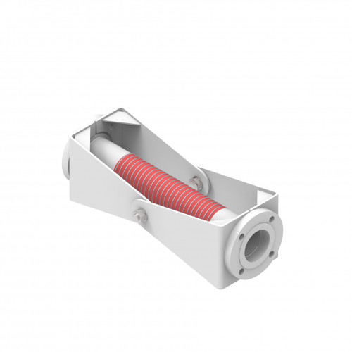The pipe hinge consists of a composite hose in a steel structure and is used as a flexible connection in floating roof drain pipes. It combines the flexibility of a hose with the strength of a solid pipe connection.